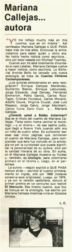 Mariana Callejas... autora [artículo] / L.C. Qué Pasa (Revista : Chile)-- no. 553 (nov. 12, 1981) p. 12. retr. .
