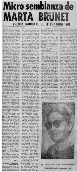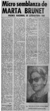 Micro semblanzas de Marta Brunet [artículo] / J. R. F. La Prensa Austral (Punta Arenas, Chile)-- oct. 30, 1975, p. 9. .
