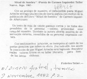 Mitad de sombra" [artículo] / Federico Tatter. El Diario Austral (Temuco, Chile)-- nov. 9, 1982, p. 2. .