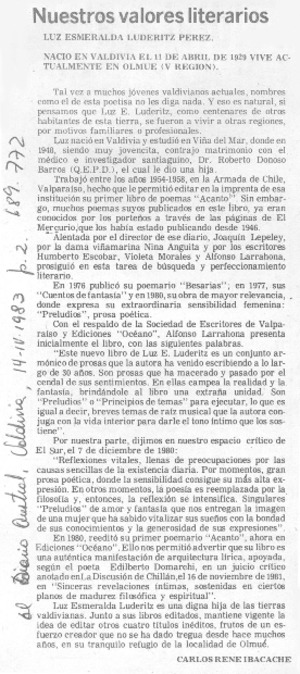 Nuevos valores literarios [artículo] / Carlos René Ibacache. El Diario Austral (Valdivia, Chile)-- abr. 14, 1983, p. 2. .