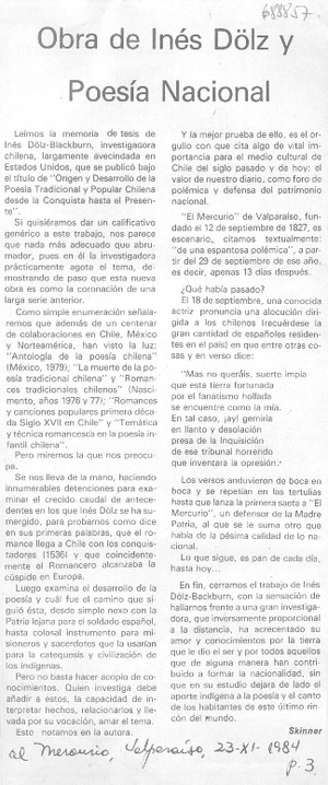 Obra de Inés Dölz y poesía nacional [artículo] / Skinner. El Mercurio (Valparaíso, Chile)-- nov. 23, 1984, p. 3. .