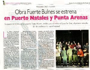 Obra Fuerte Bulnes se estrena en Puerto Natales y Punta Arenas [artículo] El Pingüino (Diario : Punta Arenas, Chile)-- oct. 21, 2010, p. 29 .