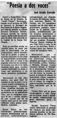 Poesía a dos voces [artículo] / José Arraño Acevedo. El Mercurio (Diario : Antofagasta, Chile)-- abr. 22, 1985, p. 3. El Mercurio (Diario : Calama, Chile)-- .