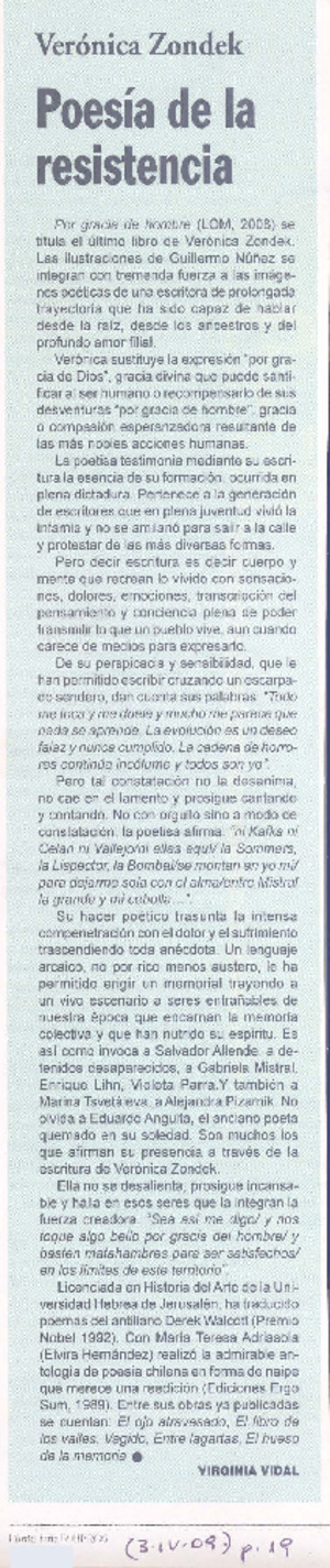 Poesía de la resistencia [artículo] / Virginia Vidal. Punto final (Revista, Chile)-- no. 682 (abr. 3, 2009) p. 19. .