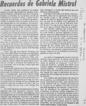 Recuerdos de Gabriela Mistral. [artículo] El Mercurio (Diario : Calama, Chile)-- abr. 9, 1971, p. 2. .