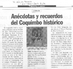 Anécdotas y recuerdos del Coquimbo histórico [artículo] El Día (diario : La Serena, Chile)-- ene. 21, 2005, p. 24. il. .