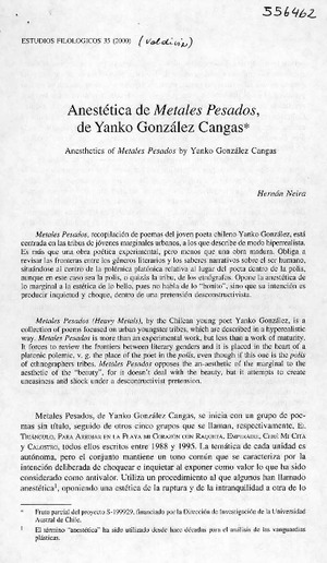 Anestética de Metales Pesados, de Yanko González Cangas [artículo] Hernán Neira Estudios filológicos. -- no. 35 (2000), p. 207-221 .