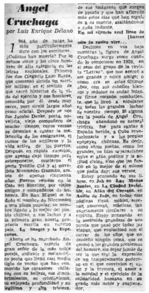 Angel Cruchaga [artículo] / Luis Enrique Délano. Las Noticias de Ultima Hora (Santiago, Chile)-- sept. 9, 1964, p. 2. .