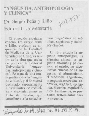 Angustia, antropología y clínica". [artículo] La Segunda (Diario : Santiago, Chile)-- jun. 26, 1981, p. 14. .