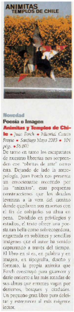 Animitas : Templos de Chile [artículo] / Ana María Larraín. Parentésis (Revista : Santiago, Chile) no. 1 (oct. 2003) p. 88. il. .