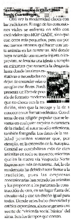 Animitas, templos de Chile". [artículo] Cultura y Tendencias (Santiago, Chile)-- no. 20 (mayo 2004) p. 39. il. .