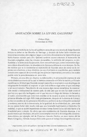 Anotación sobre la ley del gallinero [artículo] / Grínor Rojo Revista Chilena de Literatura (Santiago, Chile)-- no. 56 (abr. 2000) p. 105-109. .