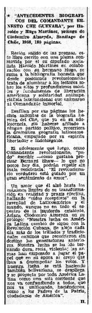 Antecedentes biográficos del Comandante Ernesto Che Guevara [artículo] / H. Punto Final (Santiago, Chile)-- no. 62 (ago. 27, 1968) p. 31. .