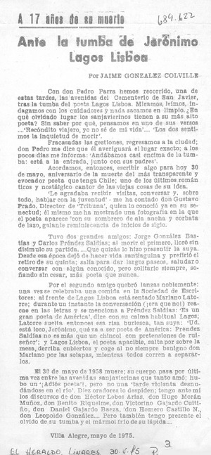 Ante la tumba de Jerónimo Lagos Lisboa [artículo] / Jaime González Colville. El Heraldo (Linares, Chile)-- mayo 30, 1975, p. 3. .