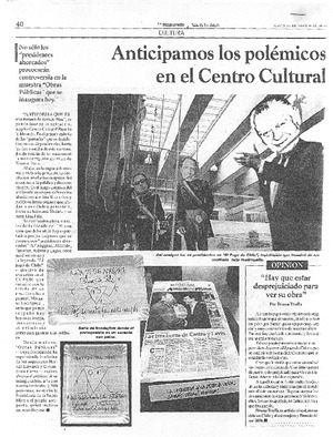 Anticipamos los polémicos artefactos de Nicanor Parra en el Centro Cultural Palacio de la Moneda [artículo]. La Segunda (Diario : Santiago, Chile)-- ago. 17, 2006, p. 40-41. .