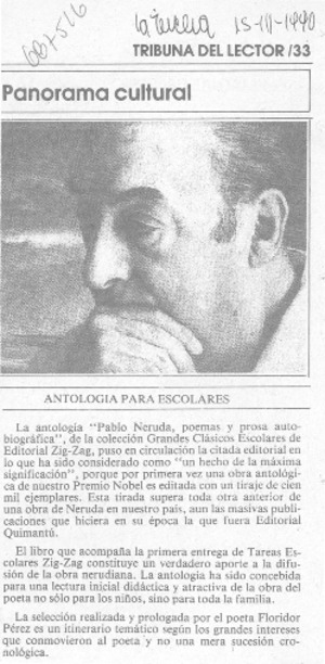 Antología para escolares. [artículo] La Tercera (Diario : Santiago, Chile)-- mar. 15, 1990, p. 33. retr. .