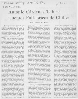 Antonio Cárdenas Tabies: cuentos folklóricos de Chiloé [artículo] / Hernán del Solar. El Mercurio (Diario : Santiago, Chile)-- sept. 19, 1976, p. 5. .