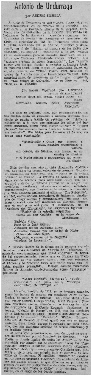 Antonio de Undurraga [artículo] / Andrés Sabella. El Mercurio (Antofagasta, Chile)-- feb. 11, 1968, p. 3. .