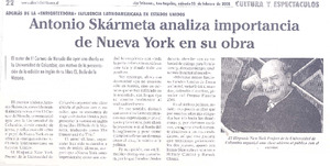 Antonio Skármeta analiza importancia de Nueva York en su obra [artículo]. La Tribuna (Los Angeles, Chile) feb. 23, 2008, p. 22 .