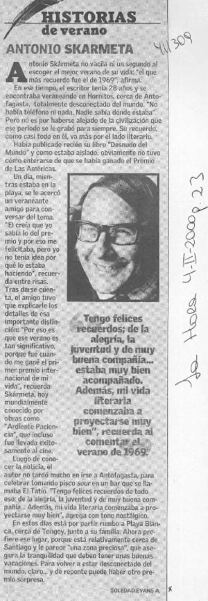 Antonio Skármeta [artículo] / Soledad Evans A. La Hora (diario : Santiago, Chile)-- feb. 4, 2000, p. 23. .