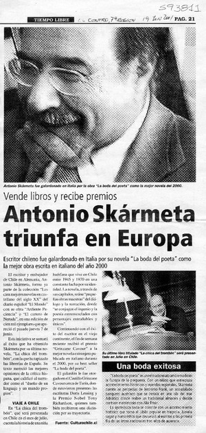 Antonio Skármeta triunfa en Europa [artículo] El Centro (Talca) jun. 19, 2001, p. 21 retr. .