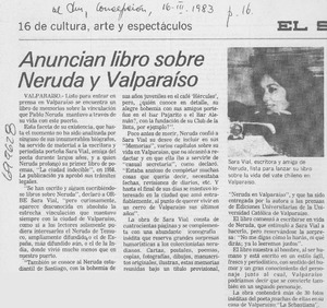 Anuncian libro sobre Neruda y Valparaíso. [artículo] El Sur (diario : Concepción, Chile)-- mar. 16, 1983, p. 16. retr. .