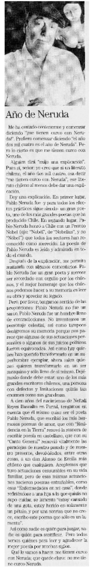 Año de Neruda [artículo] / Andrés Gallardo. El Sur (diario : Concepción, Chile)-- feb. 14, 2004. retr. .