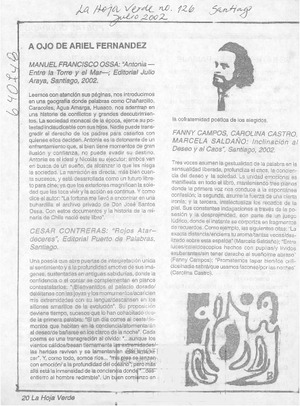 A ojo de Ariel Fernández [artículo] La Hoja Verde (Santiago) no. 126 (jul. 2002) p. 20 .