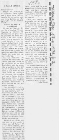 A Pablo Neruda. [artículo] Tribuna (Santiago, Chile)-- feb. 17, 1972, p. 2. .