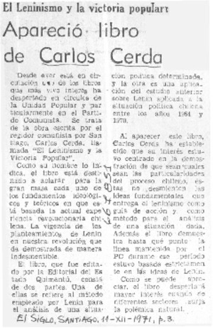Apareció libro de Carlos Cerda. [artículo] El Siglo (diario : Santiago, Chile)-- dic. 11, 1971, p. 3. .