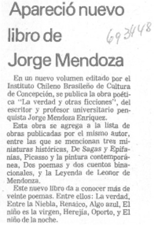 Apareció nuevo libro de Jorge Mendoza. [artículo] El Sur (diario : Concepción, Chile)-- abr. 27, 1982, p. 20. .