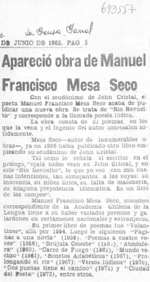 Apareció obra de Manuel Francisco Mesa Seco. [artículo] La Prensa (Parral, Chile)-- jun. 6, 1982, p. 3. .