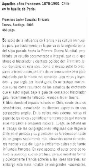 Aquellos años franceses 1870-1900. Chile en la huella de París [artículo] / Jorge Baraona González. Humanitas (Revista : Santiago, Chile)-- no. 33 (verano 2004) p. 182. il. .