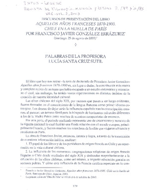 Aquellos años franceses 1870-1900 : Chile en la huella de París [artículo] / Lucía Santa Cruz Sutil. Revista de Filosofía, Historia y Letras (Santiago, Chile)-- no. 6, vol 2 (2003) p. 179-185. .