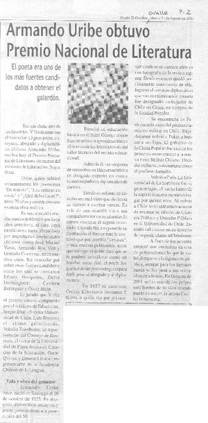 Armando Uribe obtuvo Premio Nacional de Literatura [artículo]. El Ovallino (diario: Ovalle, Chile)-- ago. 31, 2004, p. 2. .