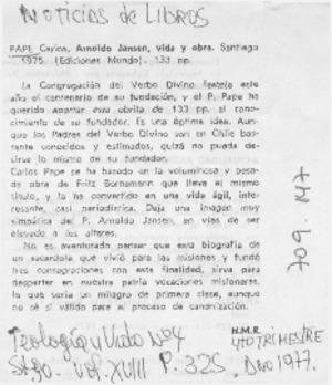 Arnoldo Jansen, vida y obra [artículo] / H.M.R. Teología y Vida (Revista : Santiago, Chile)-- no. 4 (4to. trimestre 1977) p. 325. .