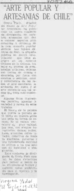 Arte popular y artesanías de Chile" [artículo] / Virginia Vidal. El Siglo (diario : Santiago, Chile)-- sept. 19, 1972. .