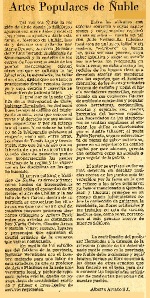 Artes populares de Ñuble [artículo] / Alberto Arraño. El Mercurio (Santiago, Chile)-- jul. 9, 1972, p. 2. .