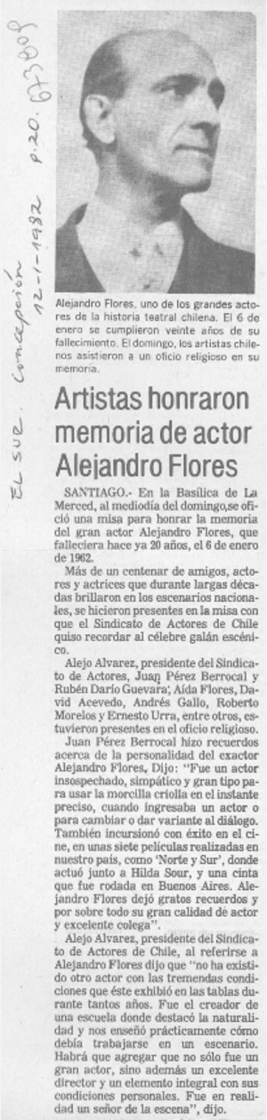 Artistas honraron memoria de actor Alejandro Flores. [artículo] El Sur (diario : Concepción, Chile)-- ene. 12, 1982, p. 20. retr. .