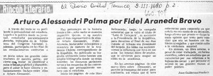 Arturo Alessandri Palma por Fidel Araneda Bravo [artículo] / Juan Guillermo Prado O. El Diario Austral (Temuco, Chile)-- mar. 09, 1980, p. 2. .