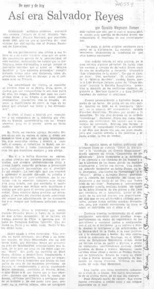 Así era Salvador Reyes [artículo] / Osvaldo Wegmann Hansen. La Prensa Austral (Punta Arenas, Chile)-- nov. 13, 1980, p. 3. .