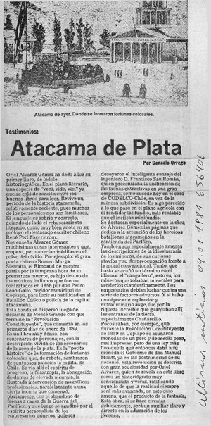 Atacama de plata [artículo] / Gonzalo Orrego. Las Últimas Noticias (Diario : Santiago, Chile)-- ene. 4, 1981, p. 19. .
