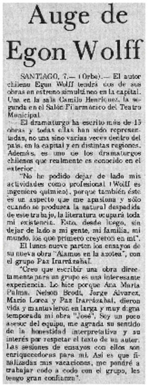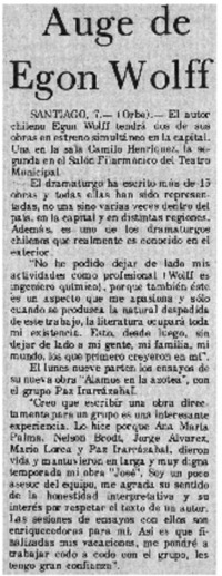 Auge de Egon Wolff. [artículo] El Mercurio (Antofagasta, Chile)-- mar. 8, 1981, p. 15. .