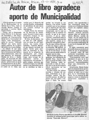 Autor de libro agradece aporte de Municipalidad. [artículo] La Estrella de Arica (Arica, Chile)-- feb. 11, 1981, p. 4. retr. .