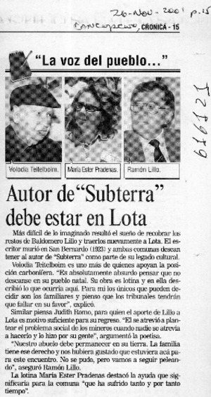Autor de "Subterra" debe estar en Lota [artículo] Crónica (Concepción) nov. 26, 2001, p. 15 .