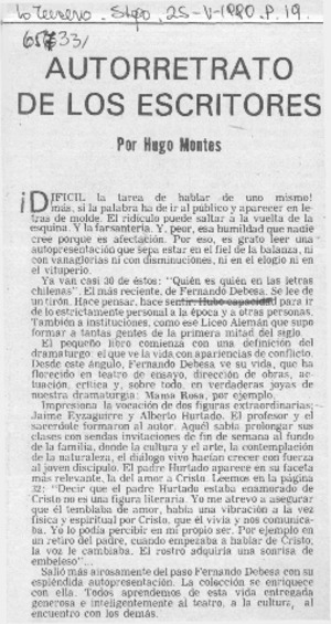 Autorretrato de los escritores [artículo] / Hugo Montes. La Tercera (Diario : Santiago, Chile)-- mayo 25, 1980, p. 19. .