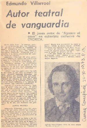 Autor teatral de vanguardia. [artículo] Crónica (Concepción, Chile)-- nov. 20, 1973, p. 13. retr. .