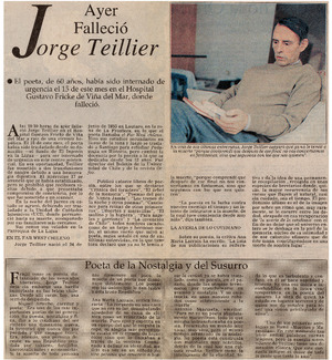Ayer falleció Jorge Teillier. [artículo] El Mercurio (Diario : Santiago, Chile)-- abr. 23, 1996. retr. .