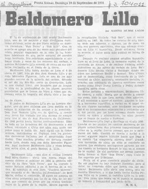 Baldomero Lillo [artículo] / Marino Muñoz Lagos. El Magallanes (Punta Arenas, Chile)-- sept. 10, 1978, p. 3. .