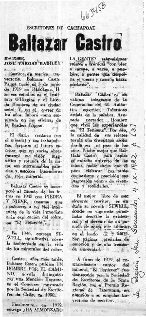 Baltazar Castro [artículo] / José Vargas Badilla. La Región (San Fernando, Chile)-- sept. 4, 1982, p. 3. .